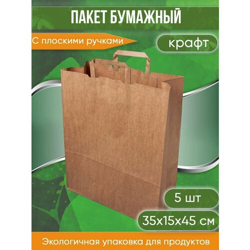 Крафт пакет бумажный 35х15х45 см, бурый с плоскими ручками , 5 шт.