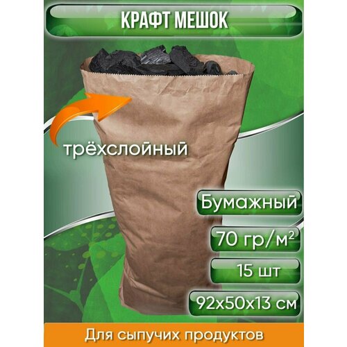 Крафт мешок бумажный трехслойный, размер 92х50х13 см, для сыпучих продуктов, 15 шт.