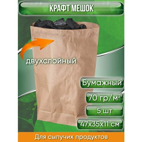Крафт мешок бумажный двухслойный, размер 47х35х11 см, для сыпучих продуктов, 5 шт.