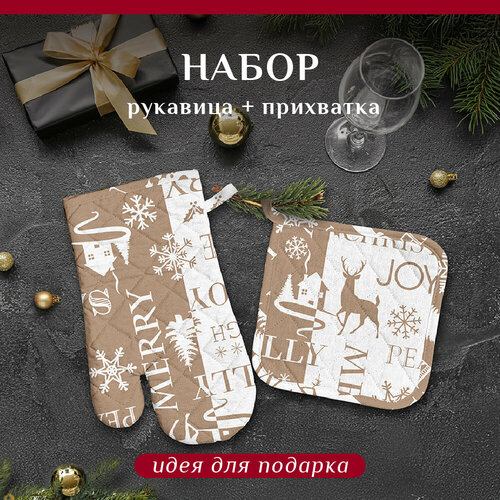 Набор кухонный Василиса рукавица + прихватка, Рогожка, хлопок 100%, Новогодние олени на бежевом