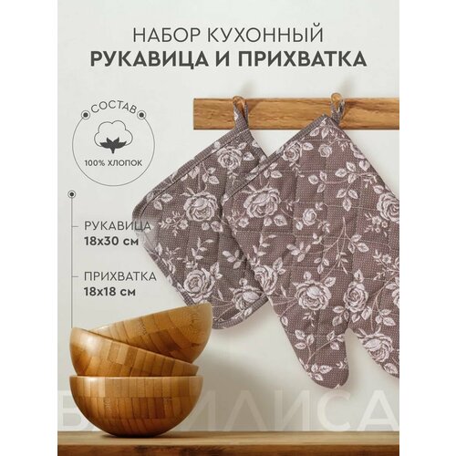 Набор кухонный Василиса рукавица + прихватка, Рогожка, хлопок 100%, Розы на льне