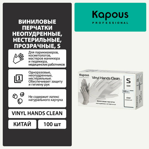 Перчатки Kapous Professional Accessories Vinyl Hands Clean, Виниловые перчатки неопудренные, нестерильные, 100 шт, S