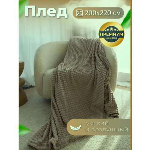 Плед плюшевый на кровать, диван / велюр / кубик / евро 200х220 см / цвет темно-бежевый, хаки / в спальню, дом, для пикника, в машину