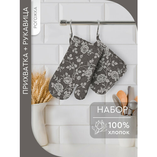 Набор кухонный (рукавица + прихватка) их рогожки, Розы на льне