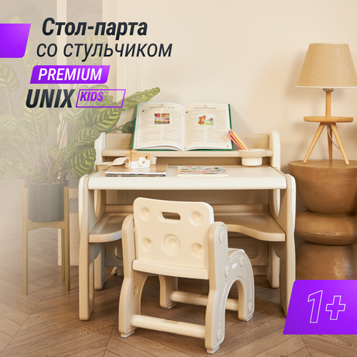 Стол-трансформер 3 в 1 UNIX Kids Grey со стульчиком, стол + стеллаж + маркерная доска, для мальчиков, для девочек, бежевый/серый