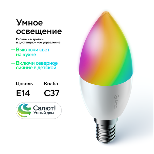 Sber Умная лампа Sber C37 SBDV-00020, E14, 5.5 Вт, 470 Лм, Wi-Fi, цветная, регулировка