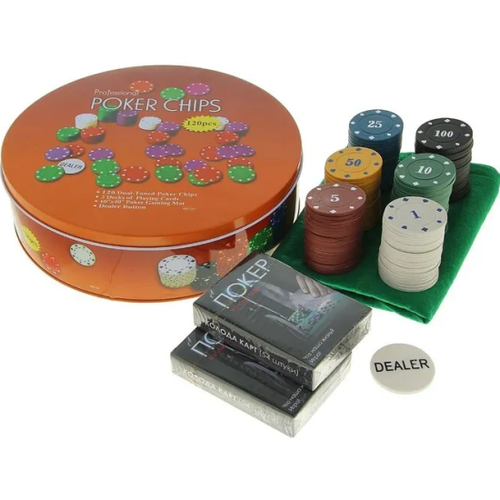 Набор для покера на 120 фишек с номиналом в жестяной коробке, 2 колоды карт, сукно