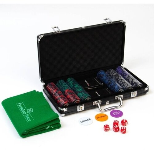 Покер в кейсе SIMA LAND (300 фишек, 5 кубиков, 2 колоды карт), с номиналом, вес фишки 13 г, 45 x 21 см