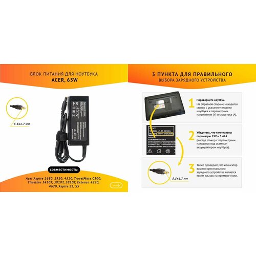 Блок питания (БП) для ноутбука Acer Aspire 1680, 2920, 4520, TravelMate C300, Timeline 3410T,3810T, 5810T, Extensa 4220, 4620, без сетевого кабеля