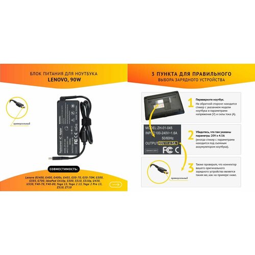 Блок питания для ноутбука Lenovo B5400, G400, G400s, G405, G50-70, G50-70M, G500, G505, G700, 20V, 4.5A, 90W, прямоугольный без кабеля