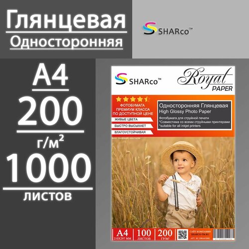 Фотобумага SHARco глянцевая односторонняя 200 г, А4, 1000 листов (10 пачек по 100л)