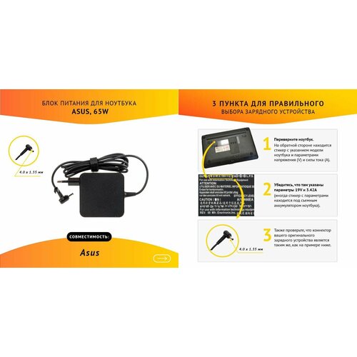 Power unit / Блок питания для ноутбука Asus 19V 3.42A, 65W, 4.0x1.35 с кабелем, OEM
