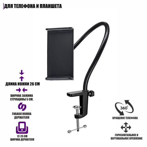 Зажим для планшета шириной до 18 см на гибком держателе с резьбой крепления 5/8" черный