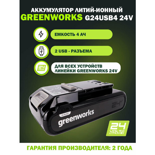 Аккумулятор Greenworks с 2-мя USB-разъемами G24USB4 24V, литий-ионный, емкость 4 Ач