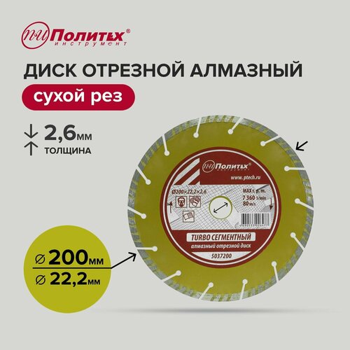 Диск отрезной алмазный по керамограниту, по камню Turbo-Сегмент 200 мм, Политех Инструмент