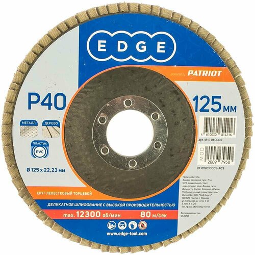Круг лепестковый торцевой КЛТ (125х22.23 мм; P40) EDGE by PATRIOT 819010005