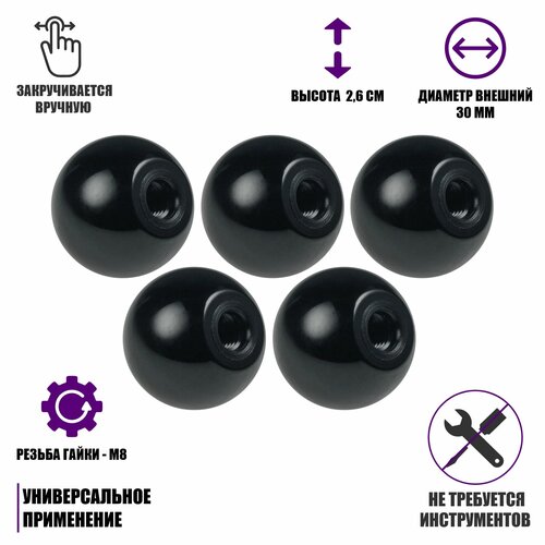 Гайка фиксатор, заглушка шар пластиковый D30 с резьбой М8, 5 шт