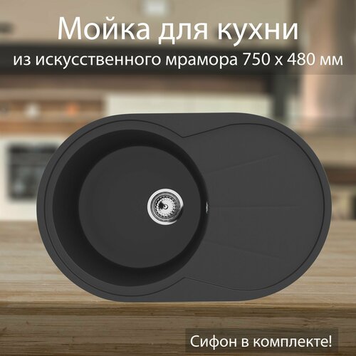 Мойка для кухни Ulgran врезная 750 х 480 мм с сифоном / Раковина для кухни из искусственного камня мрамора