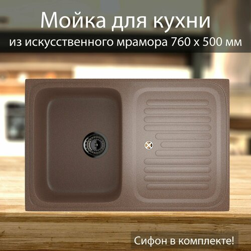 Мойка для кухни врезная из искусственного камня мрамора 760 х 500 мм со сливной арматурой, терракот / Раковина для кухни Ulgran