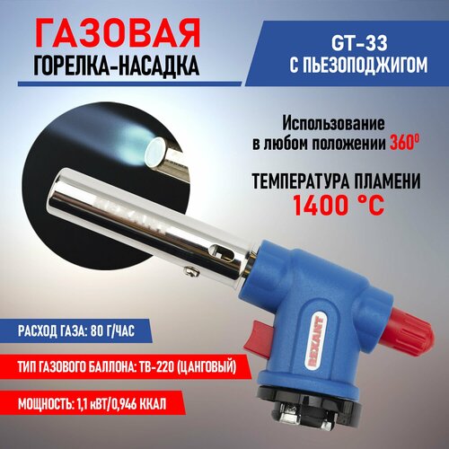 Горелка-насадка газовая с пьезоподжигом REXANT GT-33, (вращается на 360 градусов)