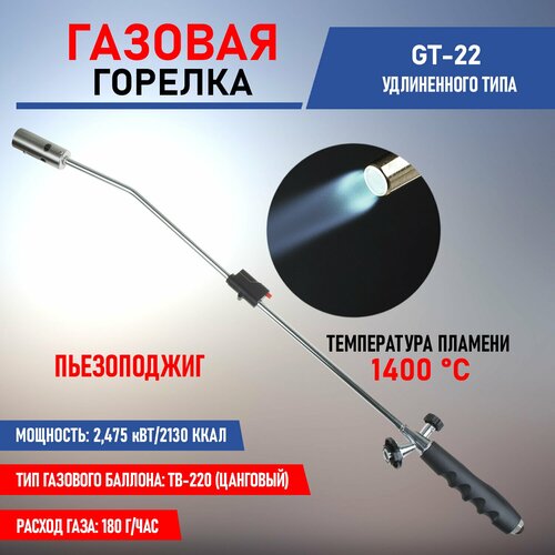 Удлиненная газовая горелка-насадка GT-22 с пьезоподжигом и пластиковой рукоятью