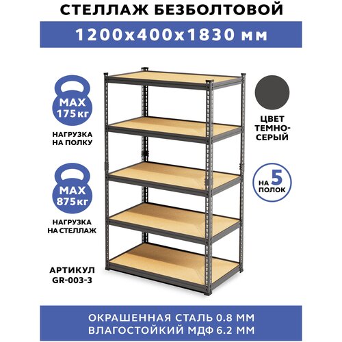 черный, темный, серыйСтеллаж металлический Gastrorag GR-003-3 - это универсальная 5-ярусная система хранения для гаража, кладовой, подсобки, балкона, лоджии, мебель лофт для дома и дачи. Стеллаж лофт можно использовать в качестве перегородки для зонирования пространства, металлического органайзера, полки для хранения вещей и инструментов, подставки для обуви, книг, игрушек. В садоводстве он пригодится в качестве стеллажа для рассады, этажерки для цветов. Упаковка имеет компактные размеры благодаря тому, что стойки для стеллажа состоят из двух частей. Стойки и рамы полок изготовлены из прочной стали толщиной 0.8 мм с порошковым покрытием темно-серого цвета, полки - из влагостойкого МДФ толщиной 6.2 мм. Стеллаж имеет практичное безболтовое соединение (тип зацепа - клепка) и легко собирается при помощи деревянной или резиновой киянки. Пластиковые подпятники надежно предохраняют пол от повреждений. Максимальная нагрузка на полку - 175 кг, на весь стеллаж - 875 кг. Высота полок регулируется с шагом 30 мм.