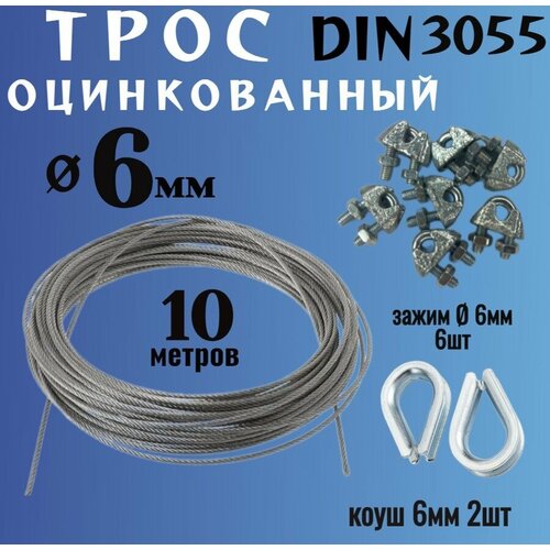 Трос оцинкованный 6мм 10 метров в комплекте с зажимом и коушем
