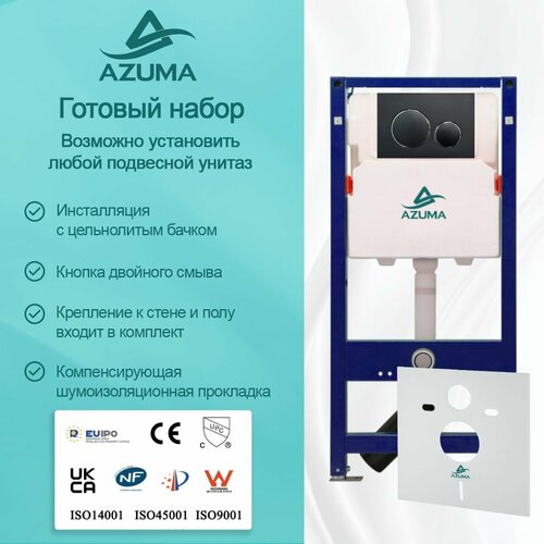 Система инсталляции для подвесного унитаза Azuma AZU507 + Кнопка смыва Slim17 AZU017.13 черная матовая с рамкой хром