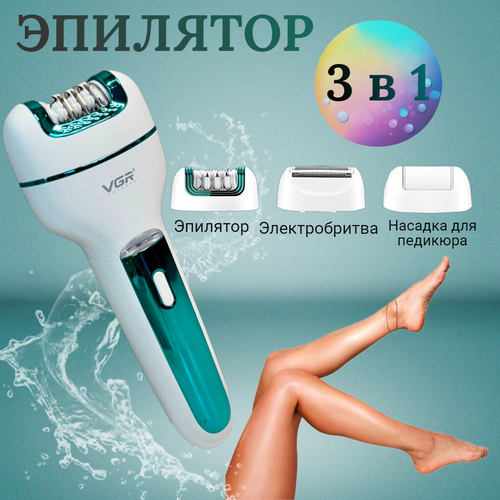 Эпилятор женский 3в1 VGR V0728 / Бритва женская / Щетка пилинг / Электрическая пемза / Депилятор золотистый, зеленый, белый