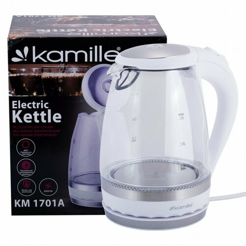 Чайник 1,5л электрический с синей LED подсветкой и стальными декоративными вставками Kamille 1701A