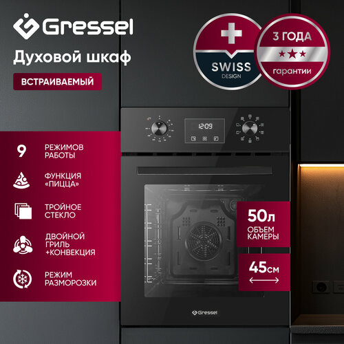 Встраиваемый духовой шкаф GRESSEL U4ES59000 45см, 9 режимов, 50л, конвекция, двойной гриль, тройное стекло, таймер