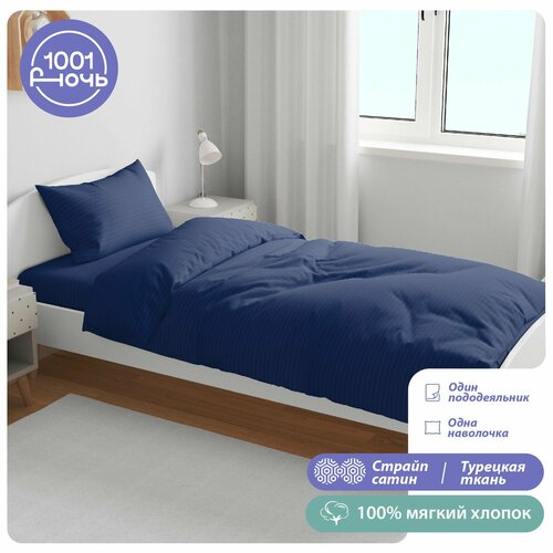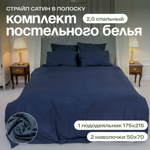 Постельное белье 1,5 спальное, Синий, Страйп сатин, наволочки 50х70