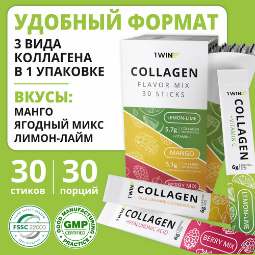 Коллаген в стиках 1WIN Микс, Вкусы: Лимон-лайм, Манго, Ягодный микс, 30 стиков