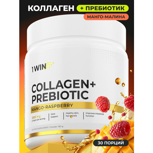 1WIN Коллаген порошок с пребиотиком и витамином C, пептидный для суставов и связок, 180 г, 30 порций, вкус манго-малина