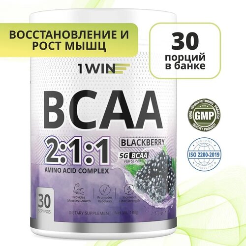 1WIN Аминокислоты BCAA 2:1:1 (БЦАА), Быстрорастворимые, со вкусом Ежевика,30 порций, 180грамм