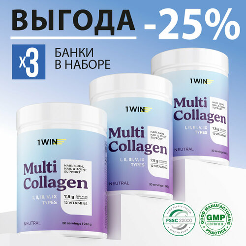 1WIN Мульти коллаген набор из 3-х шт, пептидный порошок 1, 2, 3, 5, 9 тип, витамин C для суставов, связок и кожи, вкус нейтральный