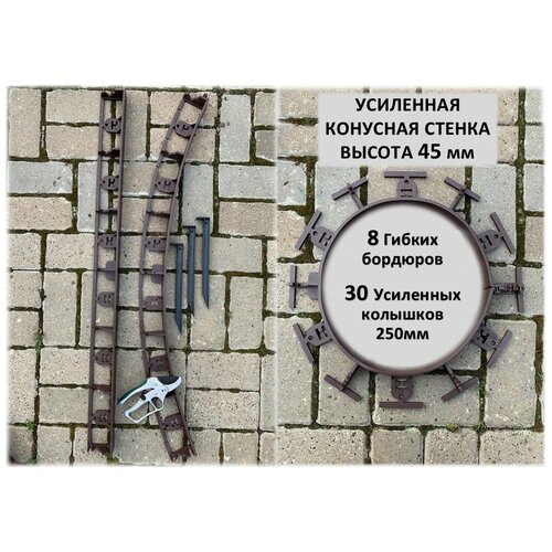 Садовый пластиковый бордюр AKAPLAST, высота 45 мм. Комплект-8 шт. и 30 усиленных колышков. Коричневый