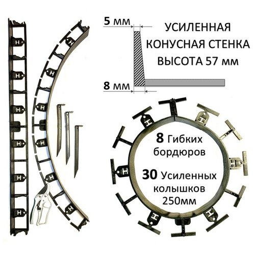 Садовый пластиковый бордюр AKAPLAST, высота 57 мм. Комплект-8 шт. и 30 усиленных колышков. Чёрный