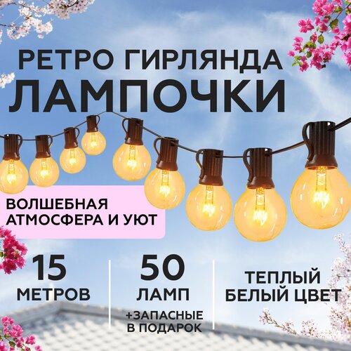 Гирлянда уличная нить, новогодняя, декоративная на окно дачи, дома, для праздника, ретро гирлянда 50 лампочек, 15 метров