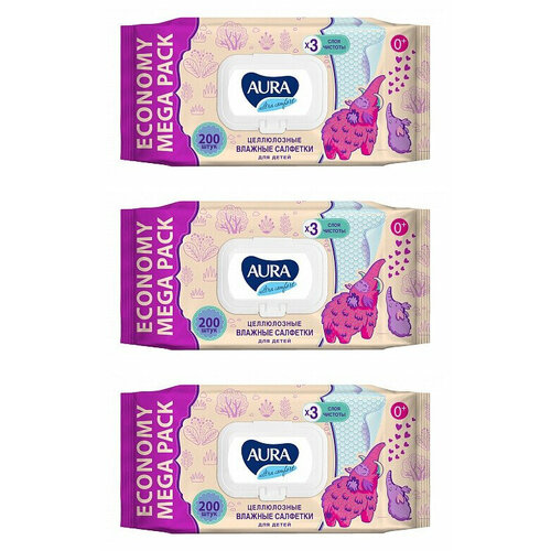 Влажные салфетки Aura детские с крышкой, 200 шт, 3 шт.