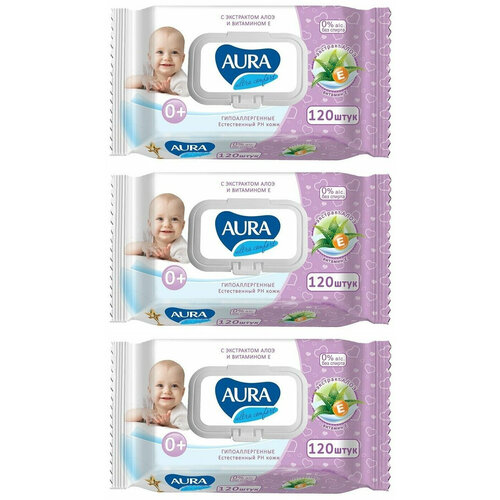 Влажные салфетки AURA Ultra Comfort для детей с экстрактом алоэ и витамином Е, 120 шт, 3 уп.