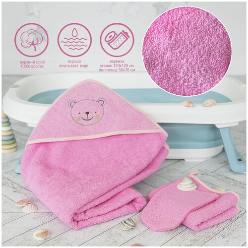 Полотенце детское с капюшоном 120х120+полотенце 30х70 см+варежка 14х21 см / Полотенце уголок детское для новорожденных
