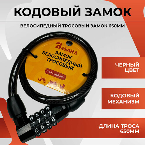 40050 Замок велосипедный тросовый с ключом, замок для коляски, для самоката BASARA B3-650 MBP, 650 мм