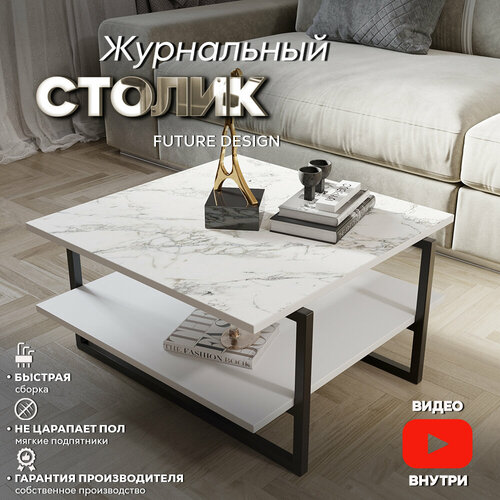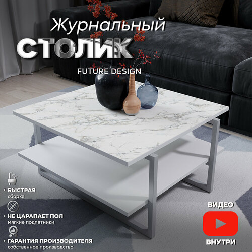 Журнальный столик лофт кофейный прикроватный для гостиной Moon Белый мрамор / Серый