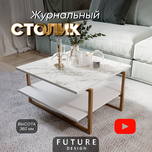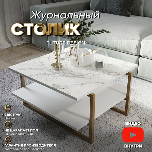 Журнальный столик для гостиной Moon, белый мрамор/золото, 60х60х36