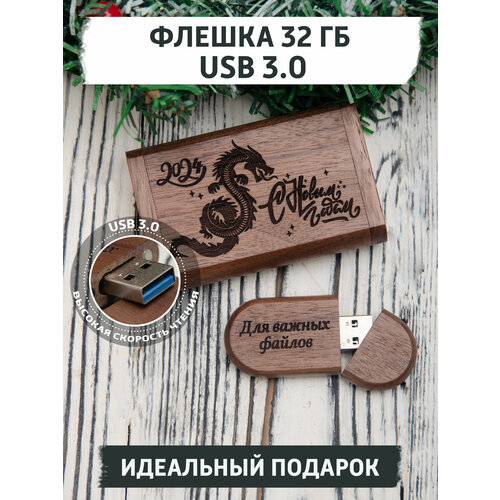 Подарочная USB флешка gifTree, 32 ГБ, деревянная, с гравировкой С новым годом 2024, с символом года