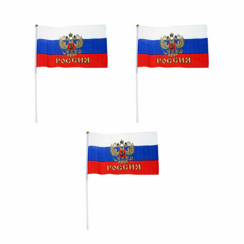 Флаг России с гербом, 20х28 см, шток (40 см), полиэстер (Набор 3 шт.)