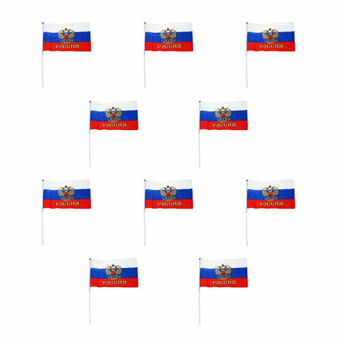 Флаг России с гербом, 20х28 см, шток (40 см), полиэстер (Набор 10 шт.)