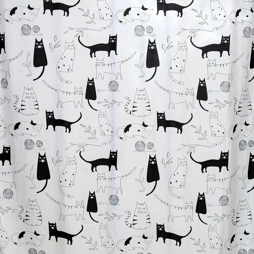 Штора для ванной Кошки 180х180 см текстиль бело-черная