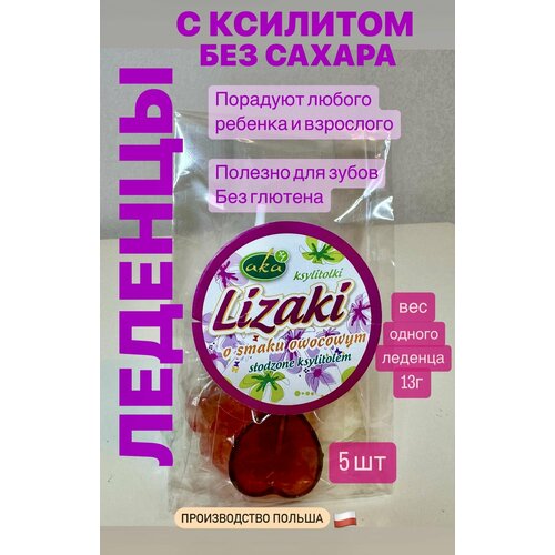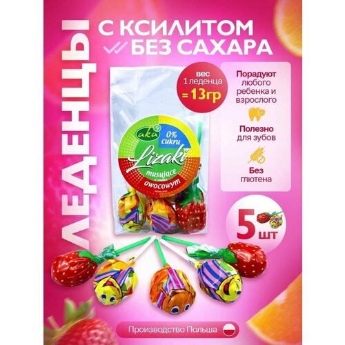 Леденцы фруктовые игристые без сахара с ксилитом на палочке ассорти 5 шт, 50 г, Польша